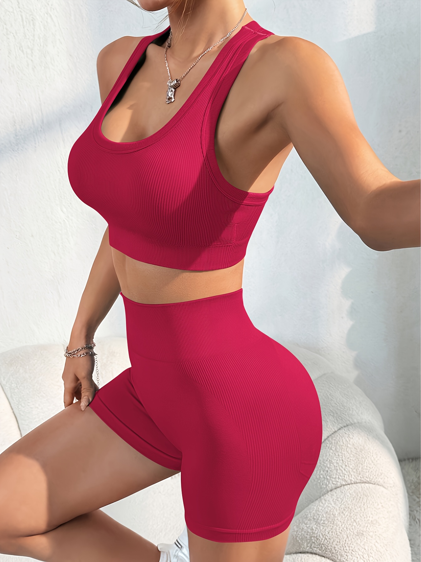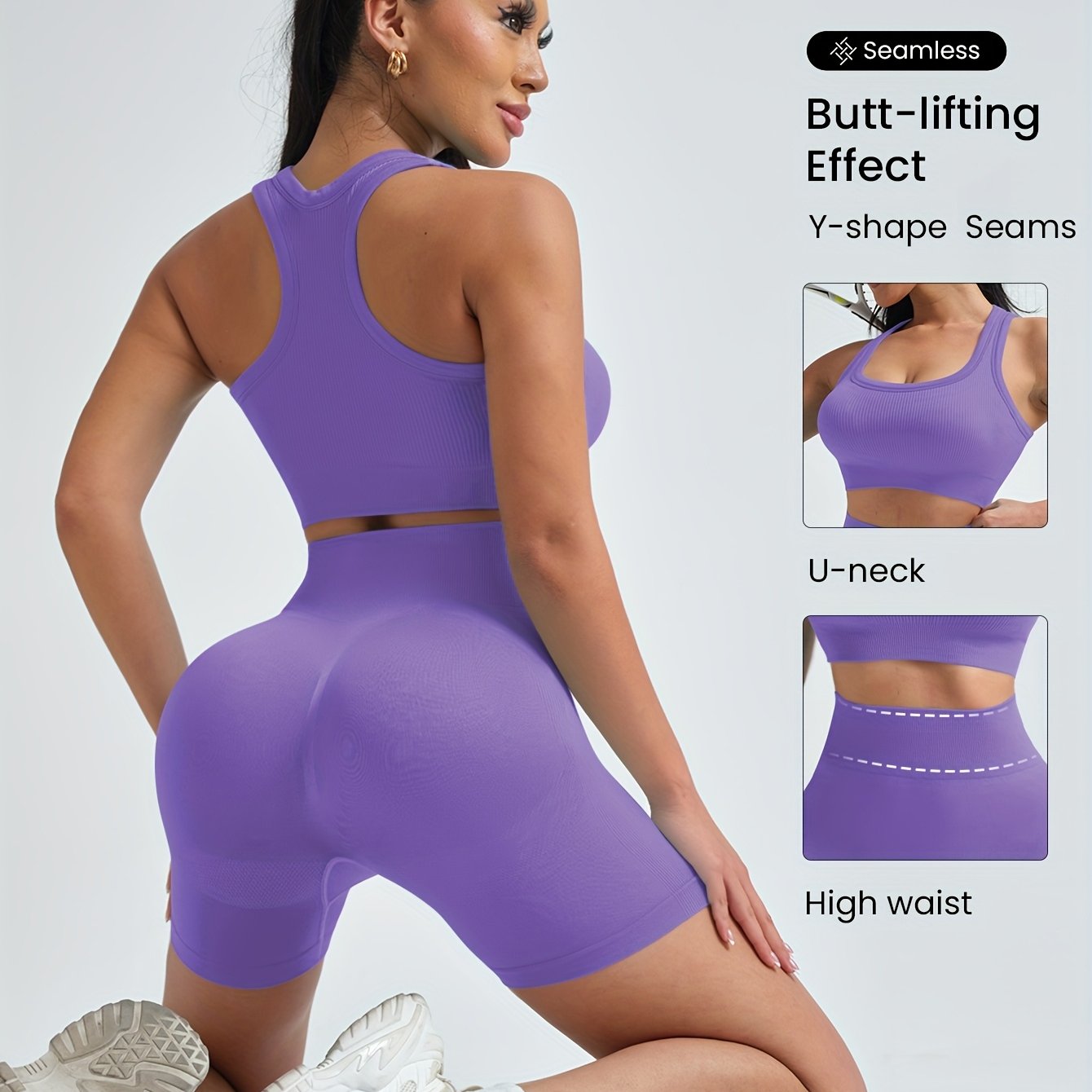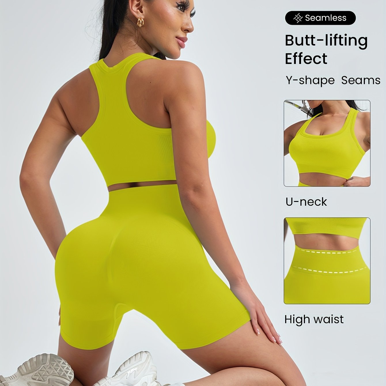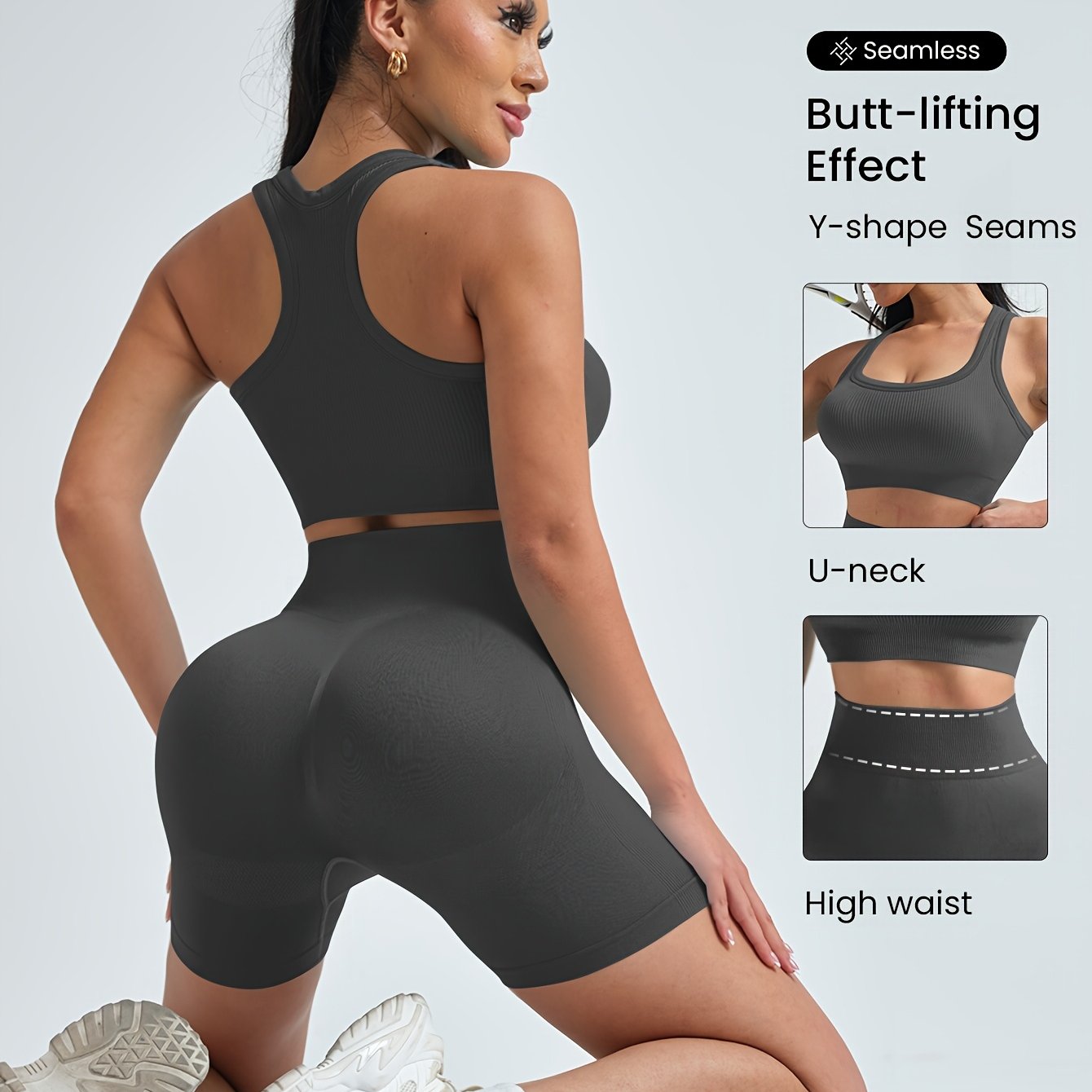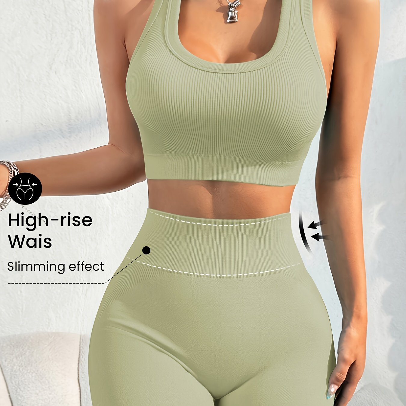 Ensemble de leggings de yoga sans couture pour femmes – Taille haute, extensible, effet fessier galbé, avec haut court assorti, design côtelé pour un soutien optimal, idéal pour le fitness et le yoga