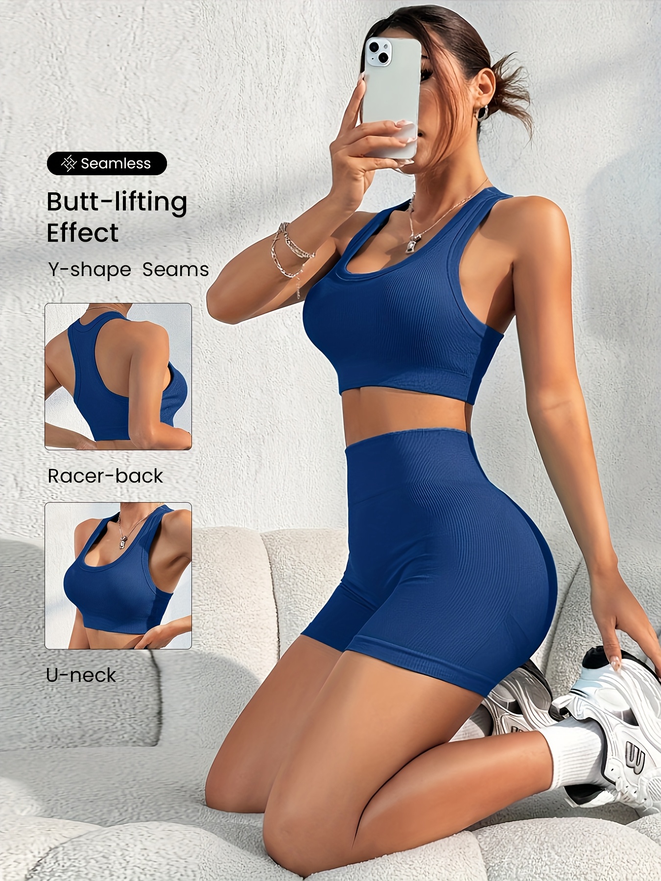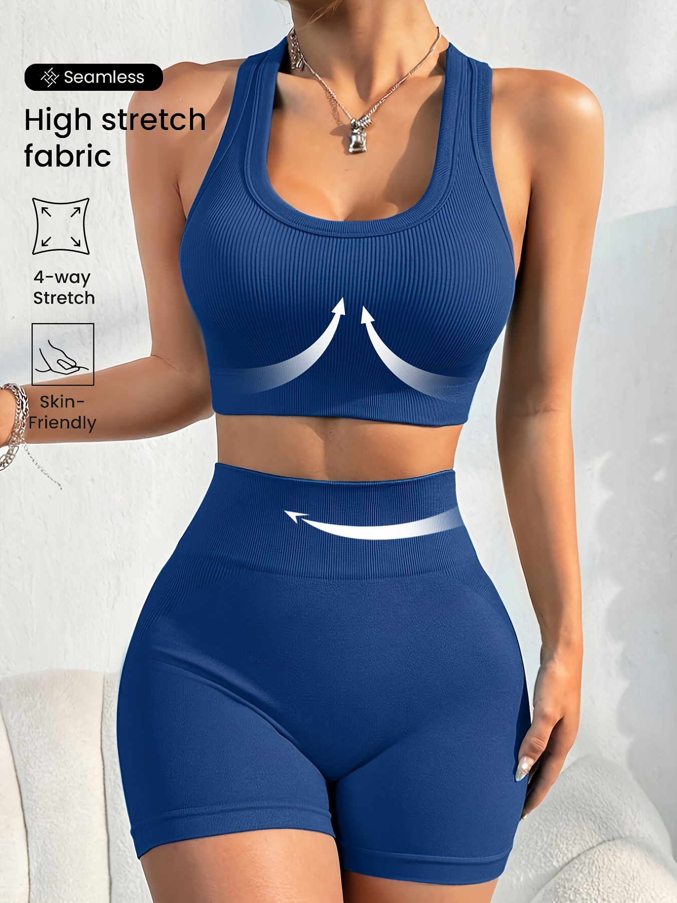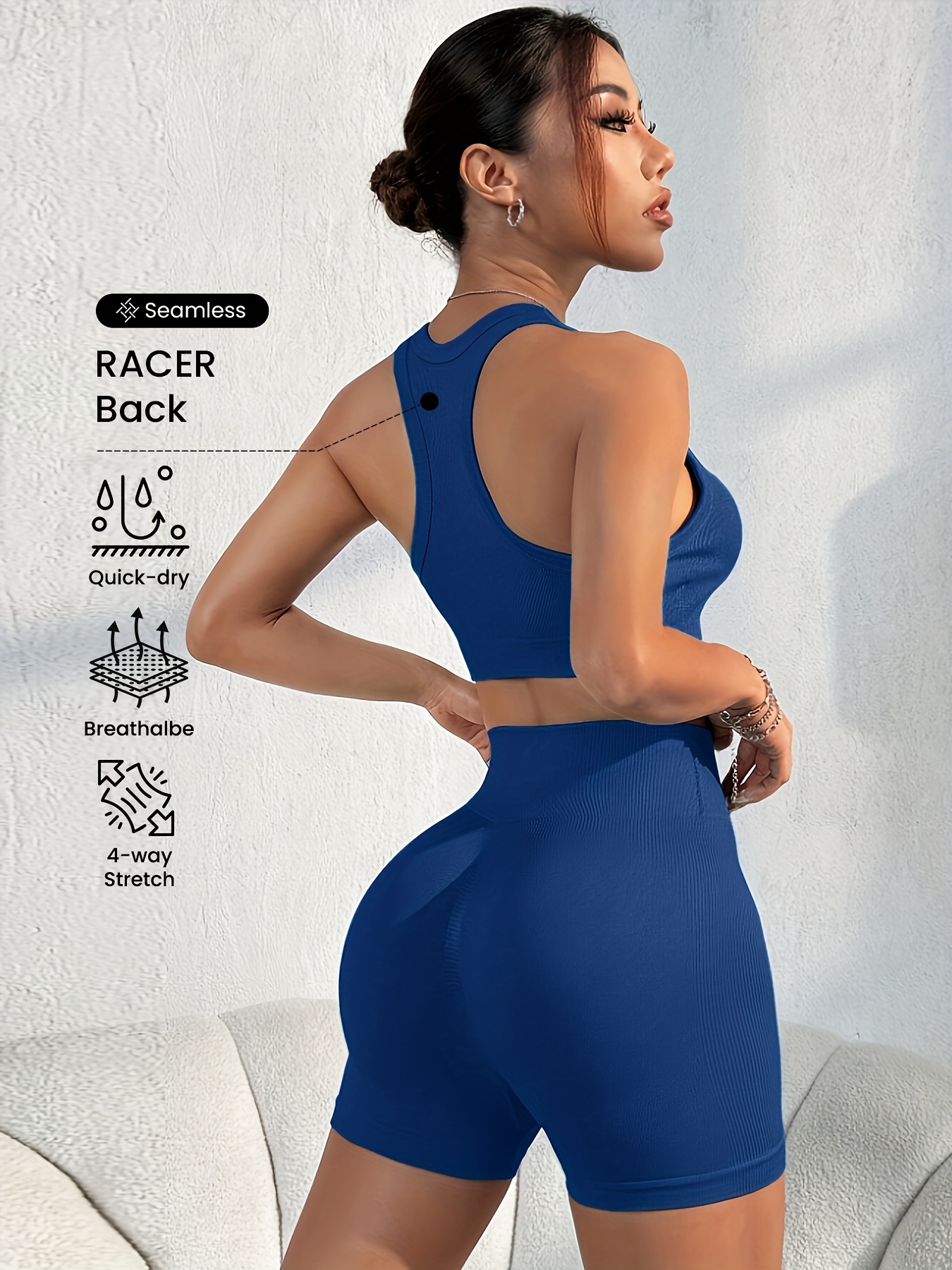 Ensemble de yoga sans couture pour femmes – Soutien-gorge de sport et short côtelés, extensible 4 directions, matière douce pour la peau, couleur unie, toutes saisons, détails côtelés, taille haute, tissu ultra-élastique
