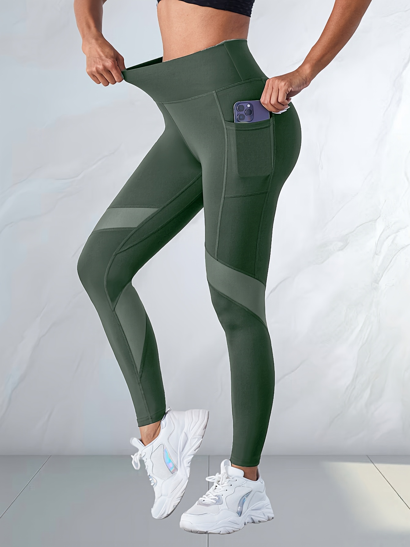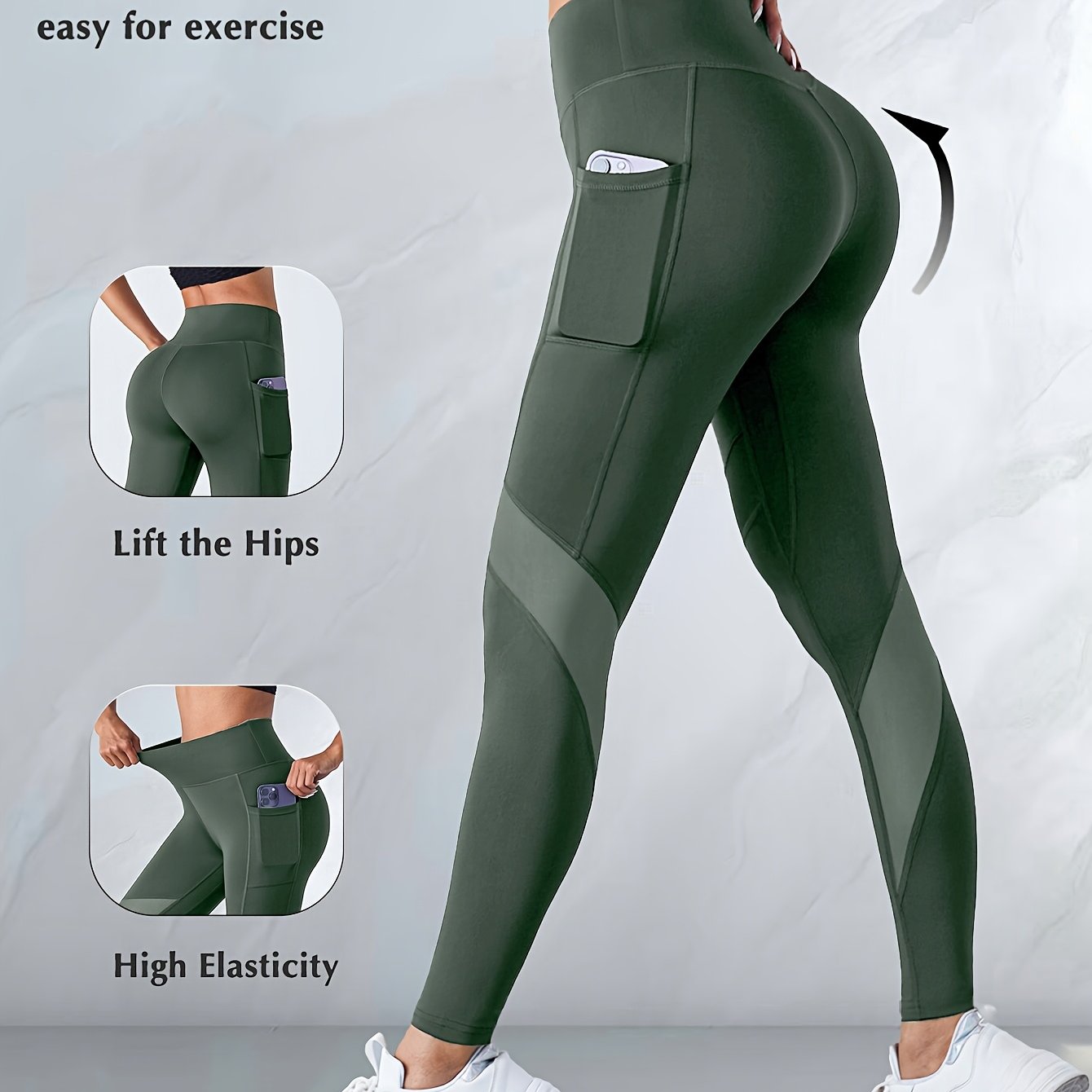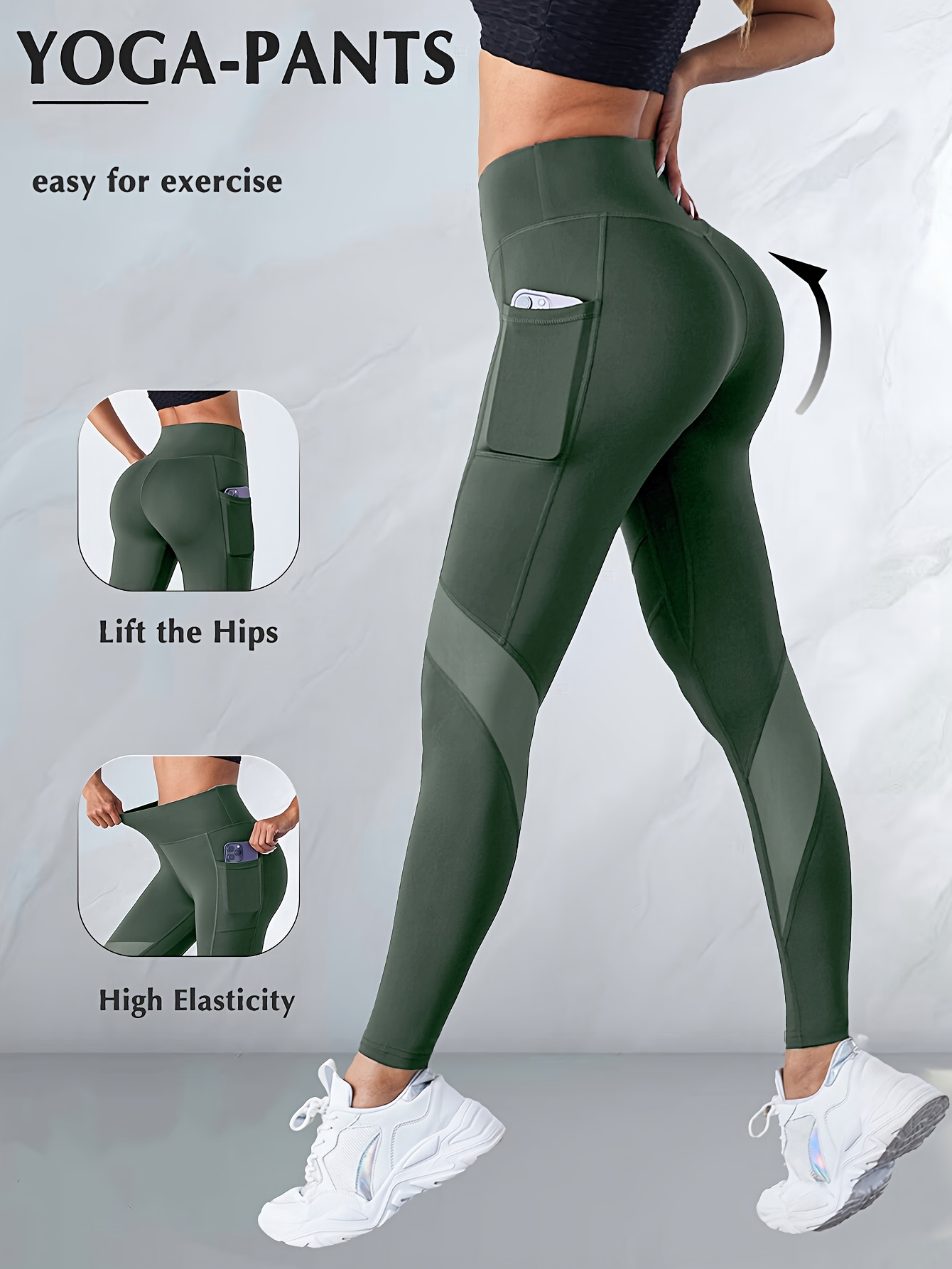 Leggings de yoga taille haute pour femmes avec levage des fesses et poches latérales – Haute élasticité, coupe ajustée, vert uni, tissu haute élasticité pour les entraînements, le yoga et les tenues décontractées, pantalons de yoga, leggings d'entraînemen